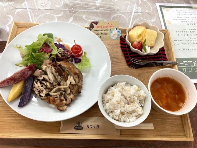 毎週月曜日にはもち麦ご飯のほか地元野菜をふんだんに使ったランチを心を込めて提供しています。