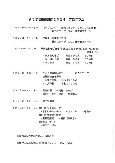 また、イベントとして、ざるそばの早食い大会や、新見ウインドアンサンブルの演奏、三光神楽の舞いなども予定されています。