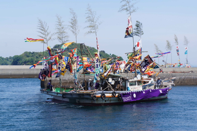 初日の宵宮祭りで、神輿が清められ、中日の御神事で、魔よけの棒術、岩坪地区のヤッコ獅子、本浦地区の蝶獅子が、神社に奉納された後、3台の神輿が、大漁旗で飾った船で、本浦地区に運ばれ、港からお旅所まで一気に走り込みます。