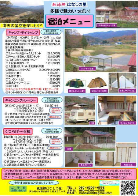 | 主催 | 桃源郷はなしの里(矢掛町上高末3749) TEL:080-6309-6558 SMS:080-6309-6558 Mail:hanasiland@gmail.com Facebookからもお申し込みいただけます。 |