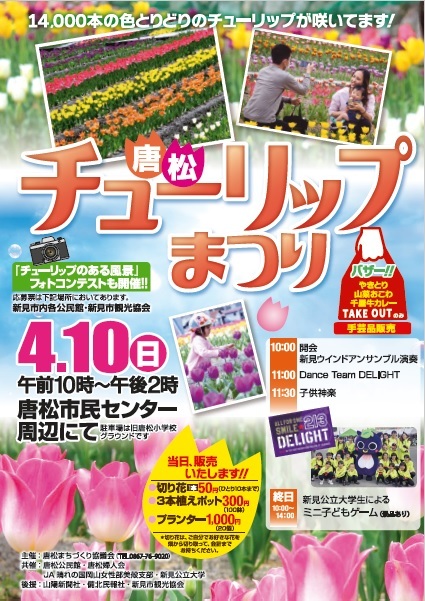 | 地域からのメッセージ | 見頃は3月下旬から4月中旬頃まで。4月10日のチューリップ祭りにもぜひお越し下さい♪ |