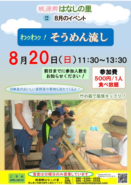 行く・食べる・会う行く食べる会う8/20わㇰわㇰ!そうめん流し開催♪桃源郷はなしの里