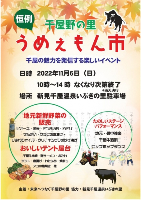 行く・食べる・会う行く食べる会う新見市千屋で「うめぇもん市」を開催します。